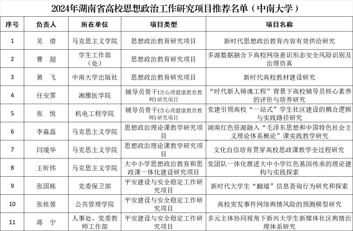 按照《关于组织申报2024年度湖南省高校思想政治工作研究项目的通知》要求,经个人申报、专家评审、学校审定,拟推荐《新时代思想政治教育内容有效供给研究》等11个项目至湖南省参加评选。