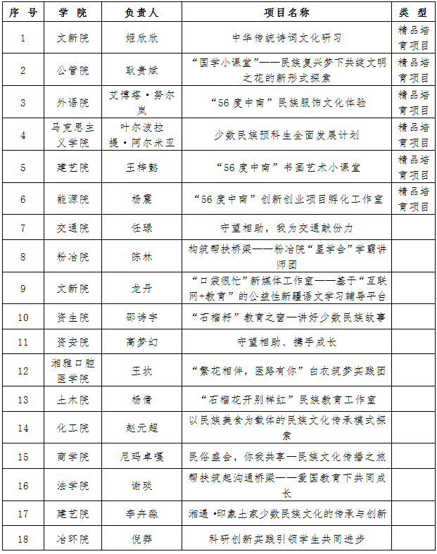 根据《关于组织开展“民族团结进步教育活动特色项目”立项的通知》的要求,经团队自主申报,学院推荐,组织评审小组评议,学生工作部部务会审定,《中华传统诗词文化研习》等18项“民族团结进步教育活动特色项目”核准立项。具体情况公示如下(排名不分先后):