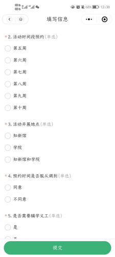 2.申报填写内容:预约申报需填写活动时间、活动开展地点、注意是否需要辅学义工;如需要辅学义工请提前一个月跟知新馆负责人预约,辅学义工覆盖数理化力计算机英语各个专业,每周可预约安排一个辅学小组进行学业辅导。学院若自己招募主讲人员,需注意明确人员安排,并将主讲人信息标注周安排表中。