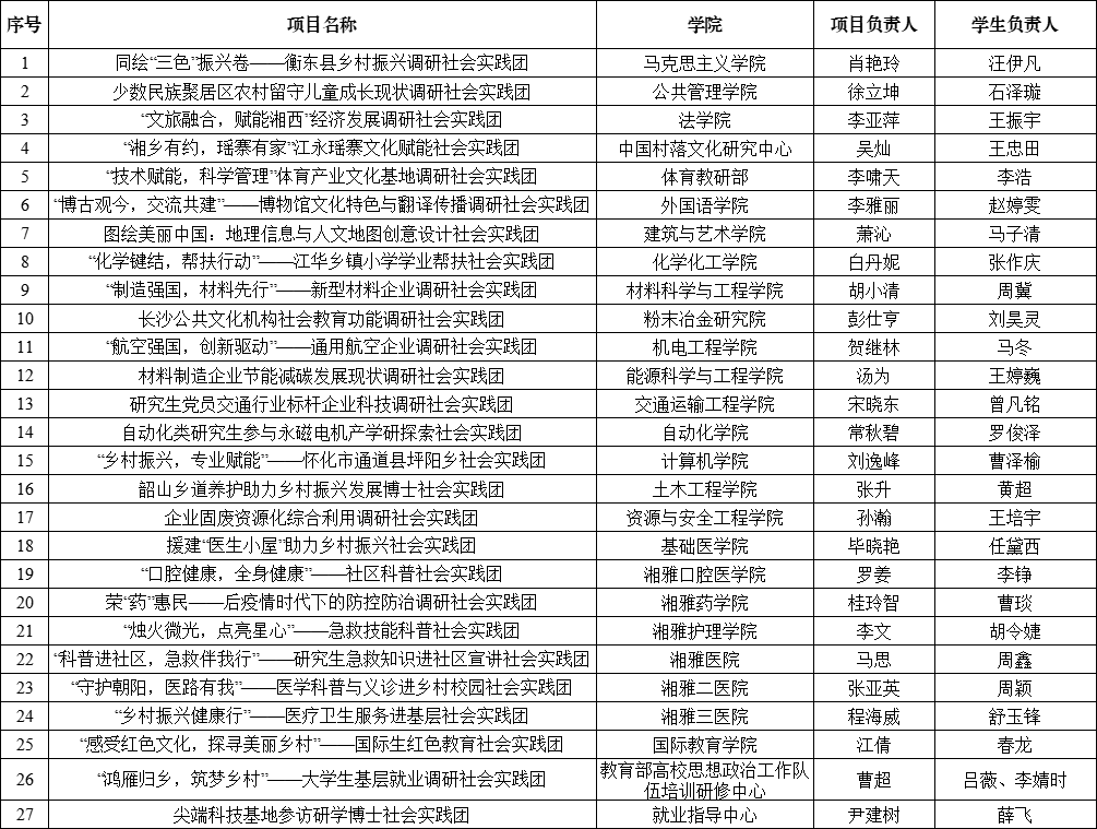 经各研究生暑期社会实践团队申请、学院审核推荐、学工部和研究生院组织专家评审,拟通过同绘“三色”振兴卷——衡东县乡村振兴调研社会实践团等27项研究生实践育人改革项目申请,现将拟立项名单公示如下。