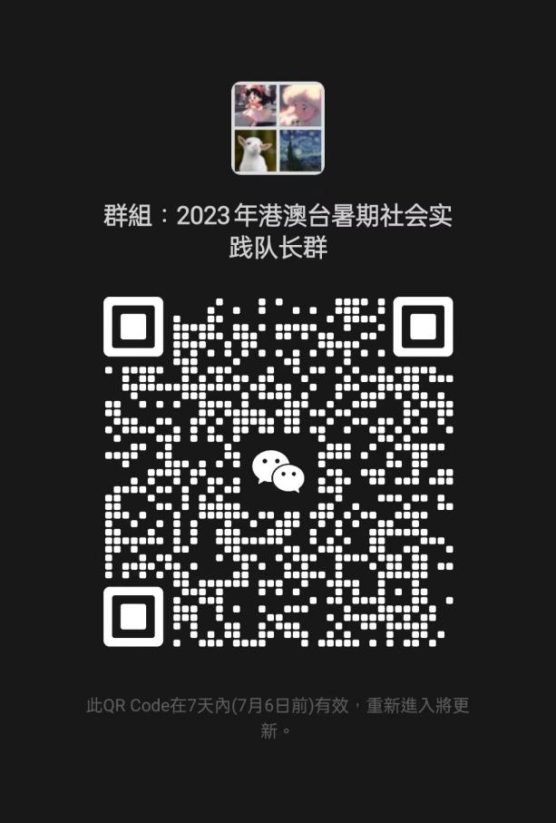 请通知学生团队队长于7月3日前进入微信群,相关要求及后续安排通知将会于群内发布。请各二级学院加强对本单位港澳台学生暑期社会实践团队的管理。
