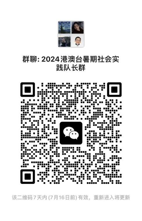 请通知学生团队队长于7月11日前进入微信群,相关要求及后续安排通知将会于群内发布。请各二级学院加强对本单位港澳台学生暑期社会实践团队的管理。
