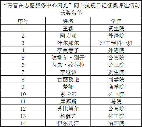 为鼓舞学生抗疫斗志,坚定抗疫信心,弘扬抗“疫”正能量。学工部开展“青春在志愿服务中心闪光”同心抗疫日记征集评选活动,优秀作品给予500元奖励并在“56度中南”公众号予以推介。经学生本人投稿、专家评审、学工部核定,共评出12篇优秀作品,现将评选结予以公示。