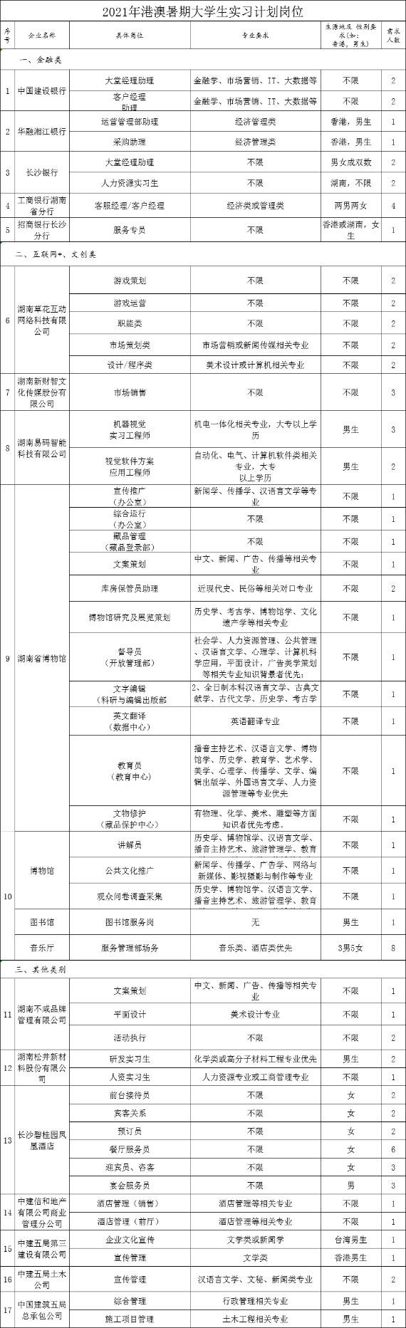为进一步增进内地(大陆)港澳台大学生对祖国的认识和了解,促进湖湘青年与港澳台青年深入交流与合作,省委统战部、省委台办、省港澳办、团省委、省青联拟联合举办“青春兴湘,同心筑梦”2021年海峡两岸暨香港、澳门大学生暑期湖南实习计划(以下简称“实习计划”),组织内地(大陆)港澳台在湘展开为期一至两个月的暑期实习交流。