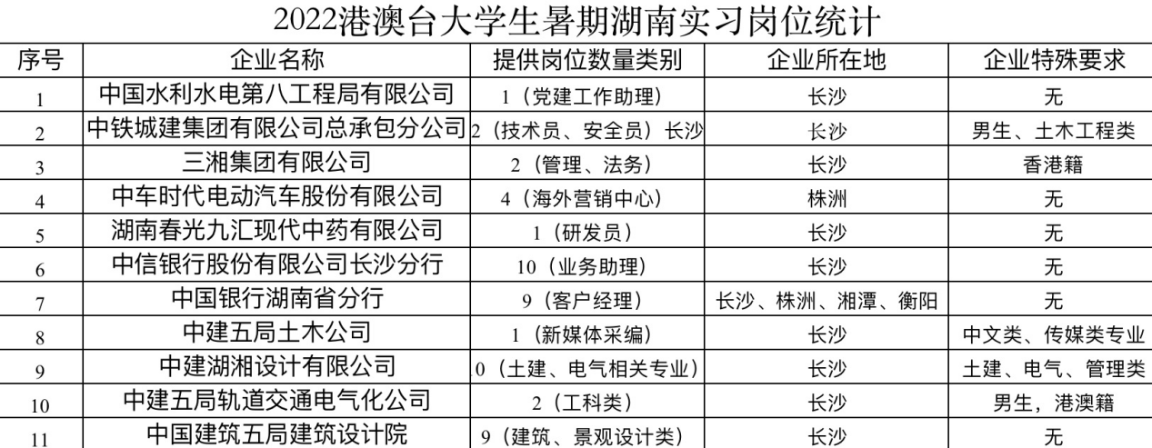 2、除上述企业实习岗位外,有其他意向岗位或企业(地点限长沙)的同学,可以在报名表中进行填写说明,团省委统战部和湖南青联将进行联系沟通,如有匹配岗位将联系对接报名学生。