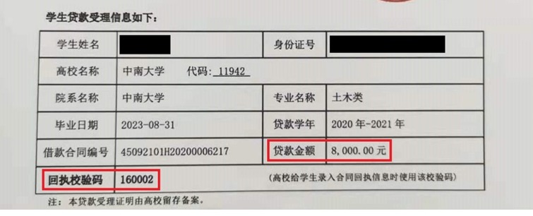 注意:贷款金额和回执校验码在《国家开发银行生源地信用助学贷款受理证明》上查询,如下图所示,请检查无误后再进行提交。