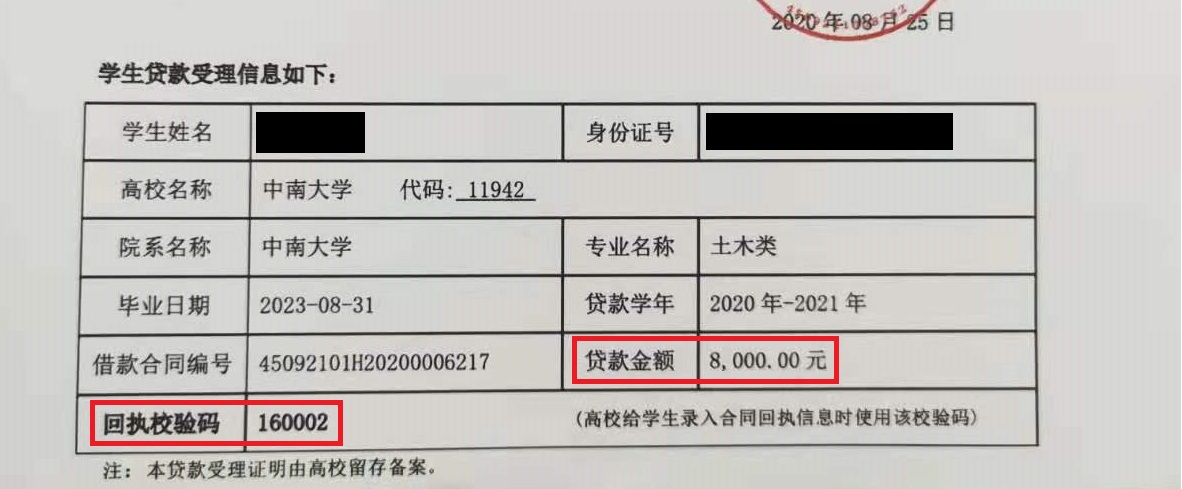 注意:贷款金额和回执校验码在《国家开发银行生源地信用助学贷款受理证明》上查询,如下图所示,请检查无误后再进行提交。