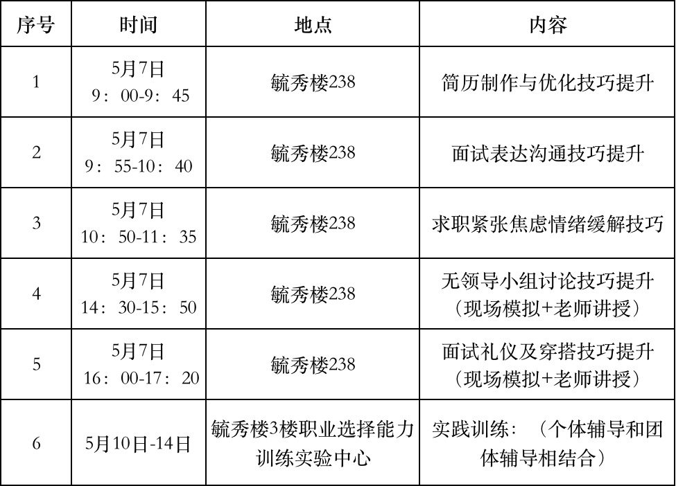 注:个体辅导(团体辅导)依托就业指导中心职业选择能力训练实验中心开展。后续将在交流群内开展需求调研,就业指导中心根据学生需求协调师资,推出辅导课程,供学生自主选择。