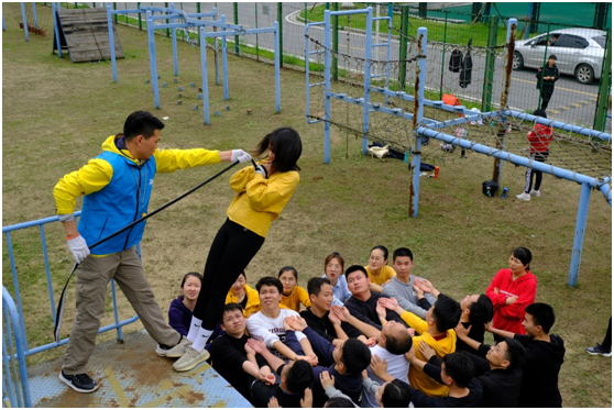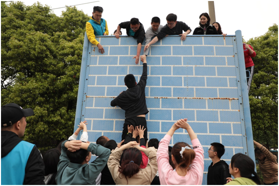在接下来的一天半时间里,参加培训的老师们先后体验了“信任背摔”、“孤岛求生”、“翻越毕业墙”、“穿越电网”、“挑战NO.1”、“驿站传书”等项目,并进行了“背摔”、“带队入场”等实操训练。