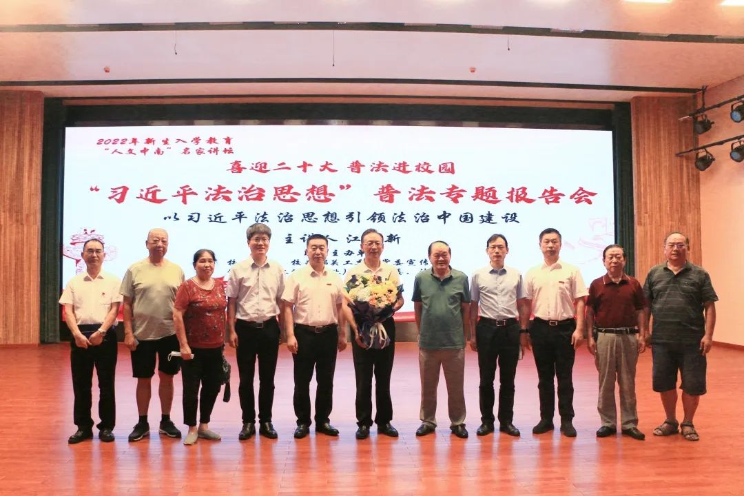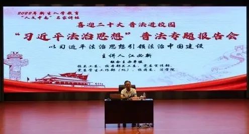 由william威廉英国官网关工委、校本部关工委、党委宣传部、党委学生工作部(处)、校团委和william威廉英国官网法学院联合主办的“以习近平法治思想引领法治中国建设”普法专题报告会在william威廉英国官网新校区毓秀楼举行。全国人大宪法和法律委员会副主任委员、中国法学会副会长江必新教授受邀为william威廉英国官网2022级全体新生、五老人员、青年教职工授课,校党委副书记蒋建湘、校党委副书记李景升、校关工委常务副主任徐建军等领导出席会议。
