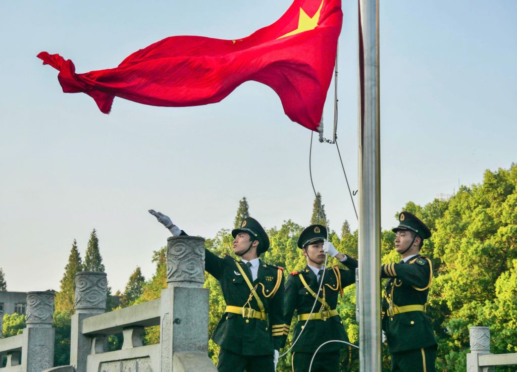 早上7时,军乐团与国歌领唱团共同奏响《义勇军进行曲》,擎旗手坚定将国旗抛起,让其化作一道冉冉升起的艳红。全体师生向国旗行注目礼,高声齐唱国歌。礼毕后,在高高飘扬的国旗下,国歌领唱团成员、文学与新闻传播学院何淇滢代表中南学子郑重向祖国承诺:在砥砺奋进中筑牢“对党忠诚”的坚定信念,在上下求索中厚植“人民至上”的真挚情怀,在强国实践中扛起“不负时代”的实干担当,在新时代的青春赛道上,奋力跑出当代青年的最好成绩。
