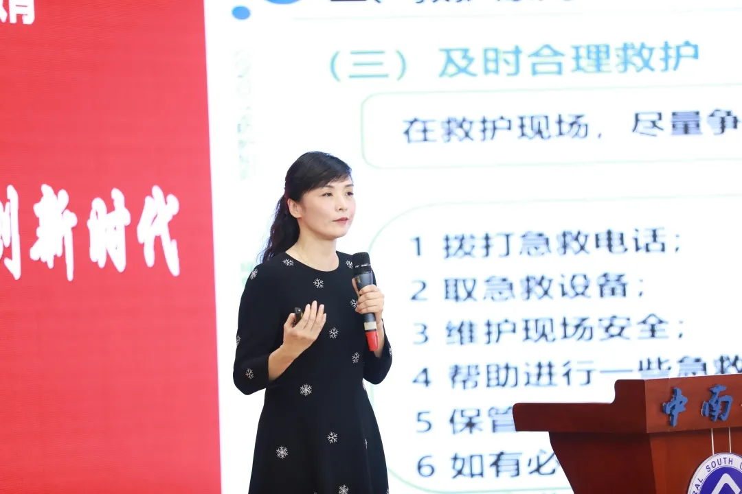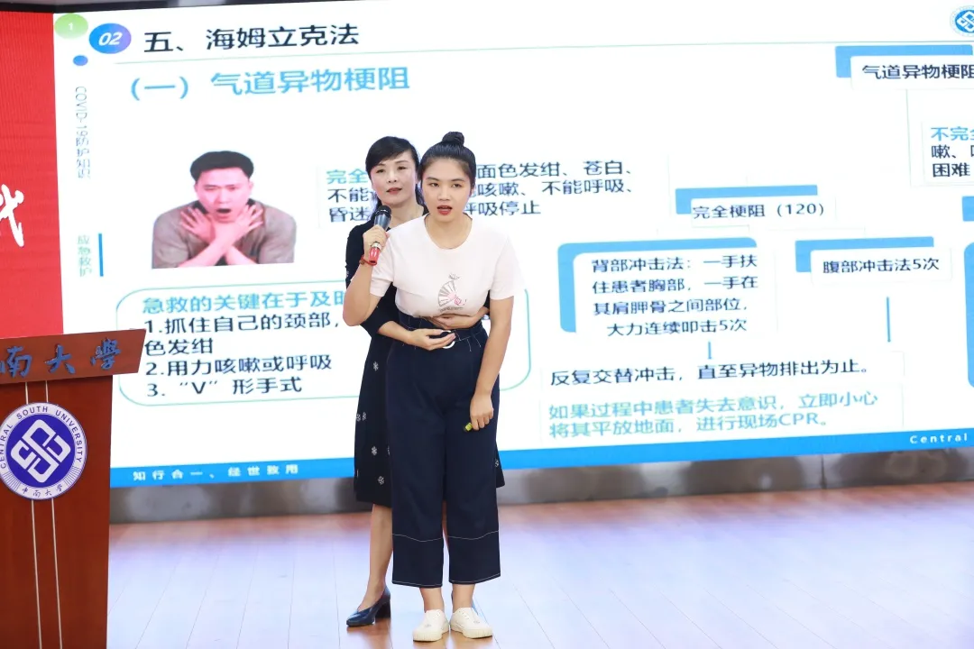 湘雅护理学院教授陈嘉以“同做健康人,共创新时代”为题,为新生详细讲解了新冠肺炎疫情防控的相关知识,强调日常生活防护的重要性。并现场讲解和演示了人工呼吸、心肺复苏、海姆立克急救法等基础医疗急救方法,讲解配以直观的图片并结合实际案例进行,深入浅出,生动易懂。