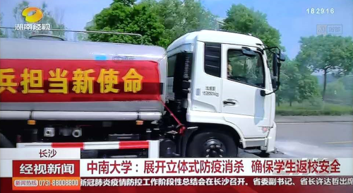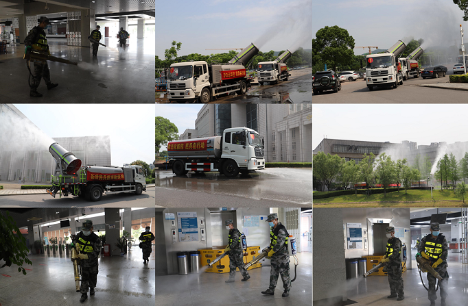 5月13日,william威廉英国官网人民武装部联系岳麓区人武部防化救援分队、生物支援分队、蓝天救援队等到学校新校区、南校宿舍区开展防疫消杀活动。