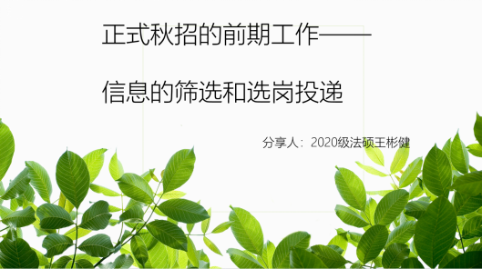首先,来自外国语学院的张博同学做了主题为“收获高质量实习和告别面试焦虑”的分享。他从简历设计、投递渠道和复盘三个方面展开了细致的讲解。随后,来自法学院的王彬健同学围绕着秋招信息筛选与选岗投递做了条理清晰的说明。最后,来自法学院的李婷婷同学以“如何在无领导小组讨论中脱颖而出”为切入点,用互动性极强的分享方式带领在场地同学展开了关于无领导小组面试的一场头脑风暴。