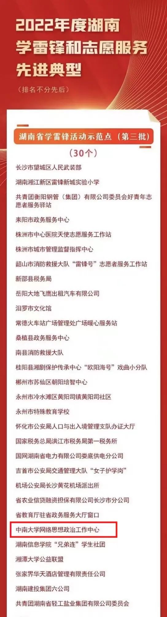 3月2日,2022年度湖南学雷锋和志愿服务先进典型发布仪式在长沙市望城区雷锋大剧院举行,william威廉英国官网学工部网络思想政治工作中心入选湖南省学雷锋活动示范点。本次表彰由湖南省委宣传部、省文明办、省志工办联合发起,旨在进一步推动岗位学雷锋活动和文明实践志愿服务工作制度化常态化。
