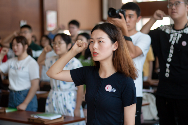大会第二项,校心联所有成员,心助会会长及朋辈心理互助队队长佩戴会徽,由校心联主席钟楷铭带领全体进行宣誓。