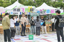 铺设了特制“书香棋盘”的“玩转阅读”区更是备受关注,到场师生们走上飞行棋盘,通过掷骰子回答对应棋格中一道涵盖诗歌、小说、名著等多个领域的文学类题目后前进的形式,吸引众多师生重温文学经典。博士研究生罗海玉同学在远处被诺大的棋盘吸引,向我们说道:“平时做实验会经常看专业书,忽略了一些经典书籍,这次通过飞行棋玩法,感觉又唤醒了想读书的心”
