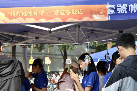 香囊飘香,共寻中秋之谜。在盲盒答题区,同学们兴致勃勃地挑选着各式香囊,每一个香囊里都蕴含着一个待解的谜题。他们小心翼翼地打开香囊,揭晓谜底的瞬间,整个现场顿时洋溢着欢声笑语。