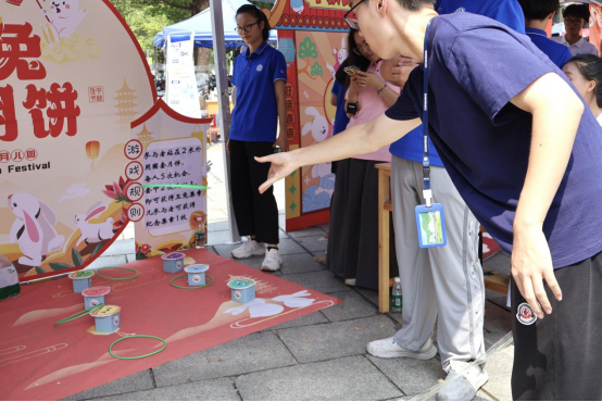 趣味横生,共游中秋之乐。趣味游戏区设置了投壶、钓花灯与套月饼三个富有传统特色的小游戏。箭矢如飞,稳稳地射入壶口,发出清脆的声响;钓竿在手,灵巧地摇动,轻轻扯动那摇曳的花灯;圆圈抛出,精准地套中诱人的月饼,伴随着同学们的欢呼与喝彩。