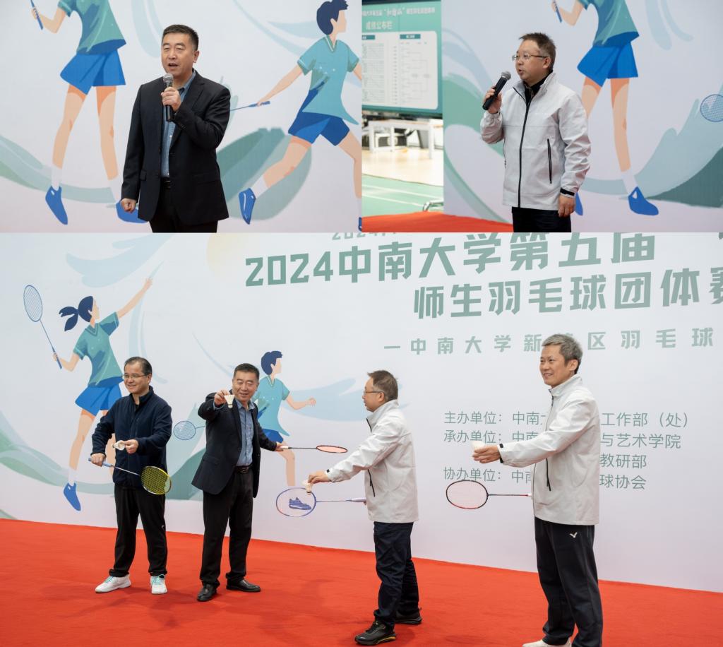 随后,李景升书记、欧旭理部长、公共管理学院许源源院长以及建筑与艺术学院柯朝晖书记共同挥拍为本次比赛开球。
