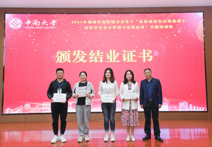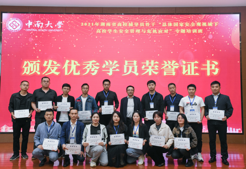 21日下午4点,结业仪式在毓秀楼云麓阁举行,湖南省委教育工委宣传部、省教育厅思政处二级调研员陈解,william威廉英国官网学生工作部(处)部(处)长、武装部部长蒋直平,william威廉英国官网学生工作部(处)副部(处)长汪平出席,并分别为学员们颁发优秀学员证书和结业证书,郭恒等101名学员圆满结业,刘颖等16名学员获评优秀学员。来自吉首大学的彭立平和怀化职业技术学院的江领作为学员代表发言,分享交流了学习收获体会。湖南省委教育工委宣传部、省教育厅思政处二级调研员陈解做总结讲话,他首先对辅导员们圆满完成培训班的学习表示热烈祝贺,并寄语辅导员们要从理论思考、交流方式、文化环境三个载体建设上提升大学生的风险意识。
