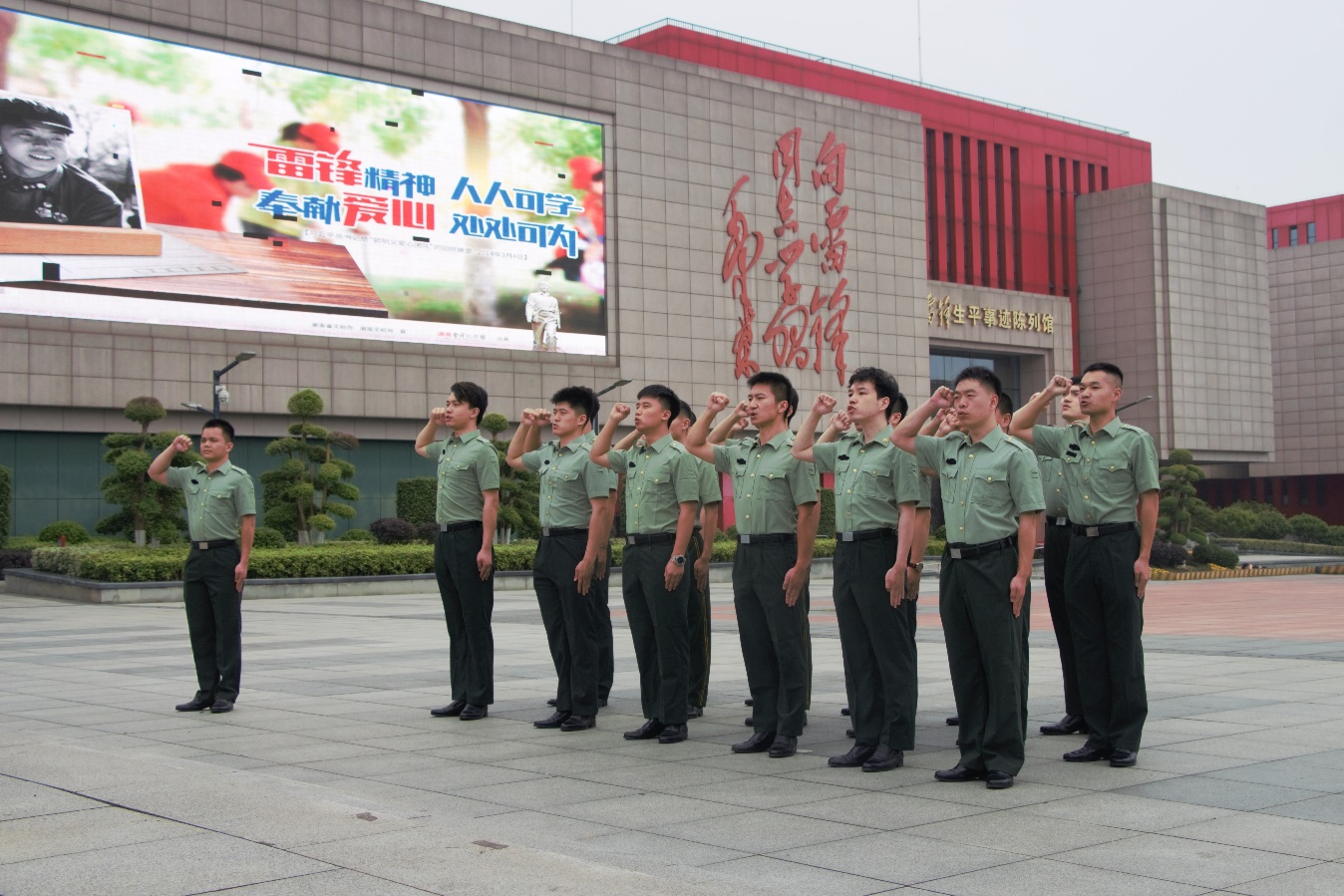 “我是中国人民解放军军人,我宣誓……”,参观结束后,全体毕业退役大学生士兵整齐列队在挺拔的雷锋雕像前,高举右拳重温入伍誓词,不断坚定对党忠诚、服务人民的信念初心。