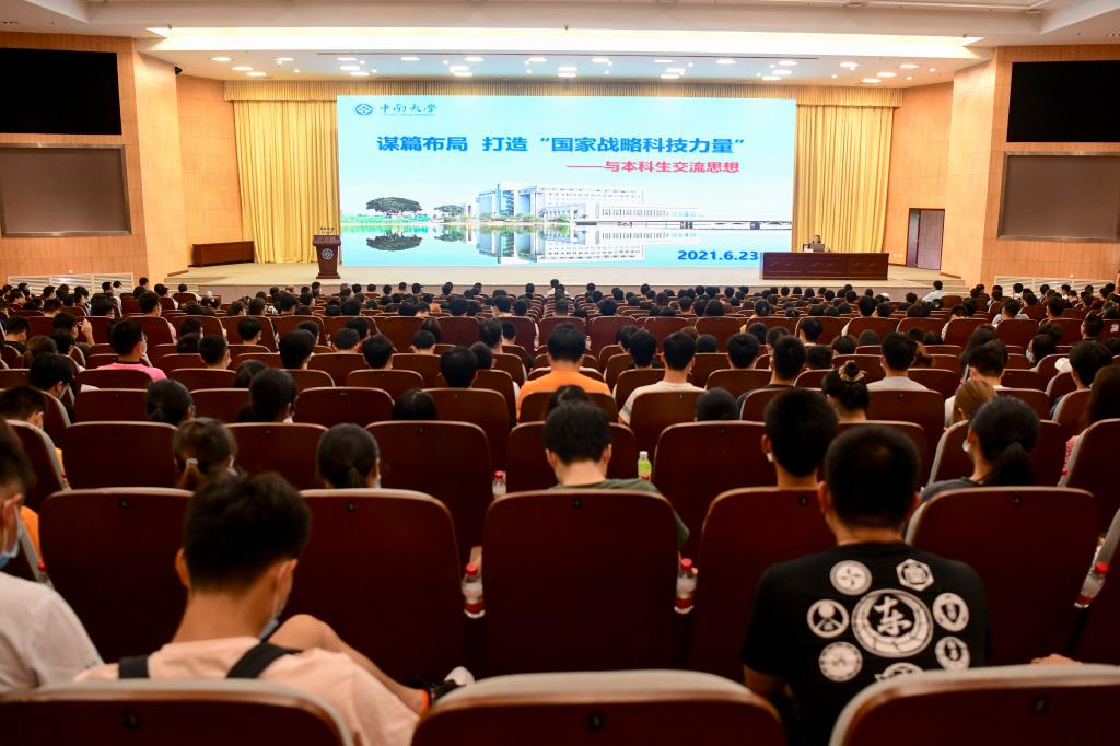 6月23日下午,校长田红旗在中南讲堂以“谋篇布局打造‘国家战略科技力量’”为题,与本科生们交流谈心,勉励中南学子牢记习近平总书记“立大志、明大德、成大才、担大任”的殷切希望,努力为实现高水平科技自立自强贡献中南力量。校党委副书记黄健陵主持。