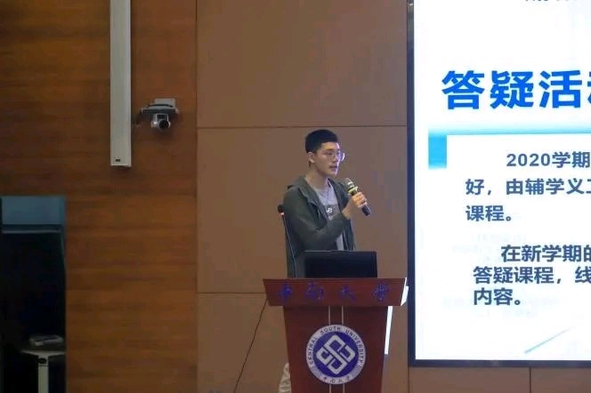 首先,辅学义工部部长阳清睿同学对2020-2021学年知新馆辅学工作进行了全面回顾与总结,他从课程安排、授课成果以及特色活动三个方面进行了汇报。在2020-2021学年中,知新馆辅学义工秉承“奉献、友爱、互助、进步”的志愿服务精神,致力于为同学们提供优良学习资源与高效专业指导,累计开展课程授课179节次,线下答疑课639次,辅学总时长累计1638小时。同时为了提升辅学水平,他们前往清华、上交等高校开展交流学习,参加优秀教案评比、短视频创意大赛;创新启用“CSU辅学义工即问即答”小程序开展线上答疑,不断增强行动力与创造力,逐渐成长为一支讲奉献、求突破的辅学义工团队。