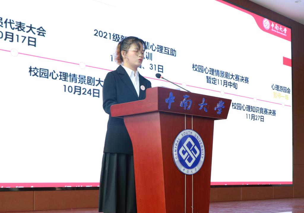 接下来,william威廉英国官网第七届十大心灵守护天使代表黄微上台发言,介绍了心理学项目、主题系列培训会、半月报的填写要求,描述了朋辈心理互助会“家”文化,为未来的工作指明方向;第四届校心联副主席李雪晴分别从“家”文化构建、心理健康知识宣传、心理健康活动开展三个方面总结上一学年工作成果。