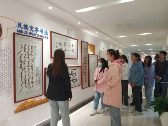 会议伊始,大家在古丽老师的带领下,参观了民族团结文化墙、民族团结进步之家等民族团结进步教育实体资源。同学们在老师的带领下参观了民族文字书法作品、民族特色饰件、民族建筑物模型等充满各民族文化的内容,并体验了民族服饰模拟。随后同学们移步民族团结进步之家,参观室内摆设的乐器和特色物件,同学们体验了民族乐器,一名同学则向大家演示了他们的民族乐器。同学们为美妙的乐声发出了阵阵掌声。