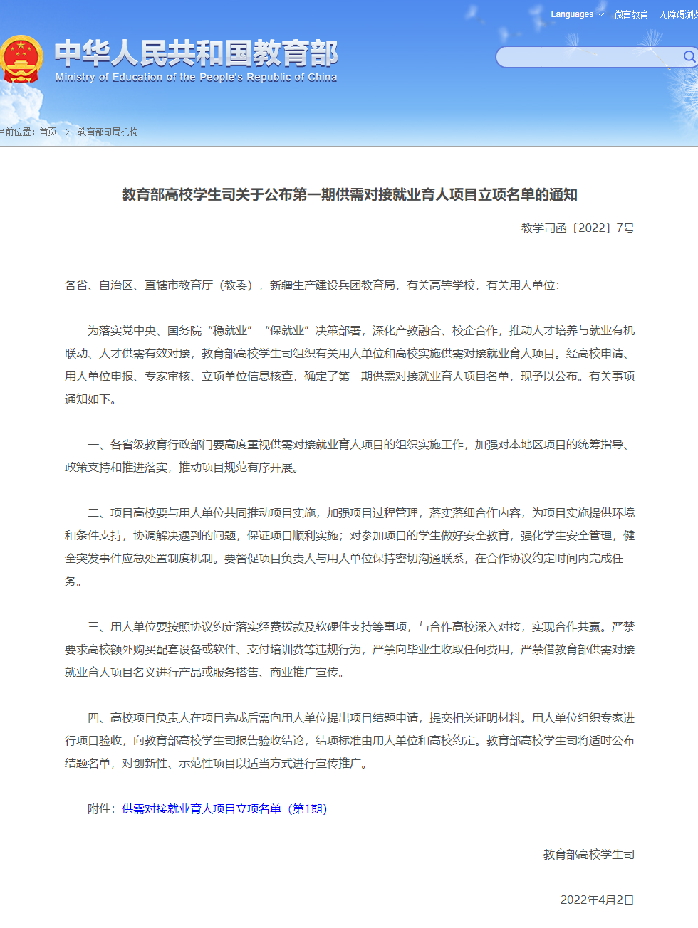 此次供需对接就业育人项目由教育部高校学生司组织有关用人单位和高校开展实施,是落实党中央、国务院“稳就业”“保就业”决策部署的重要举措,通过政府搭台、企业支持、高校对接,深化产教融合、校企合作,推动人才培养与就业有机联动、人才供需有效对接。