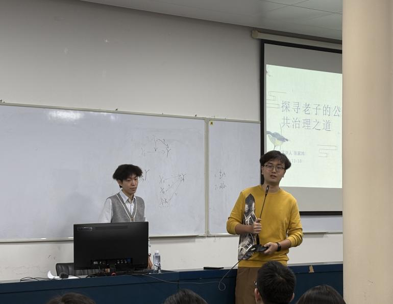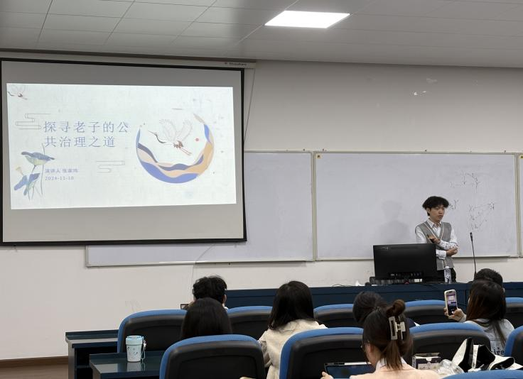 2024年11月10日晚上18:00,“公行天下·聚焦美丽中国”学术沙龙第二期在william威廉英国官网铁道校区公共管理学院院楼308教室举行。此次沙龙以“探寻老子的公共治理之道”为主题,由william威廉英国官网人文学院24级哲学研究生张家玮同学作为主讲人,由william威廉英国官网公共管理学院24级社会学研究生谢承霖同学作为主持人。本次学术沙龙活动吸引了学院一百余名研究生到场聆听,现场学术氛围浓厚。