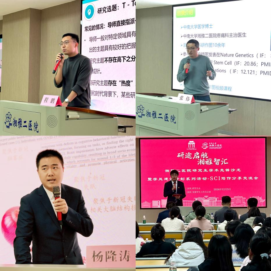 为提升研究生科研思维和SCI论文写作技巧,营造积极向上的学术氛围,由医院党委学生工作办公室主办、研究生会承办的“研途启航,湘雅智汇”研究生学术先锋沙龙暨学风建设系列活动——SCI论文写作交流会,于12月5日在医院科教楼203教室成功举行。活动特别邀请了医院疼痛科青年教师张伟博士、精神病与精神医学博士研究生程鹏、影像医学与核医学硕士研究生杨隆涛三位优秀的青年科研代表为大家带来精彩分享,本次活动由研究生会学习实践部阳树森同学主持,党委学生工作办公室陈亮辉主任、邓艳红副主任出席,全体研究生辅导员、近200名研究生参与。