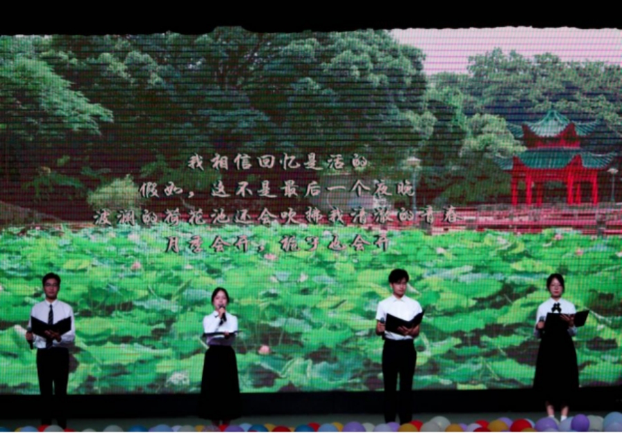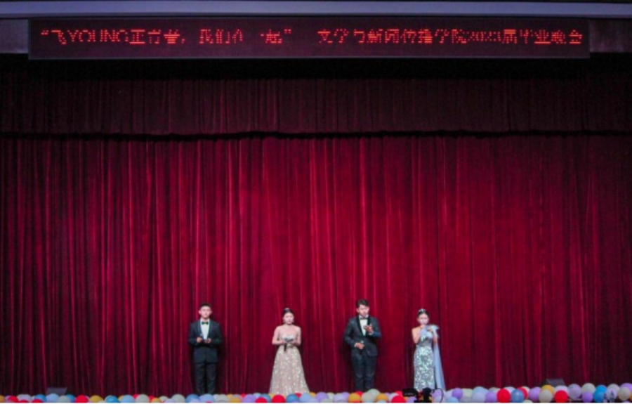 由大一,大四,研三等三个年级的四名朗诵者带来的《春秋来信》,以抒情诗的形式将文新学子们美好的光阴故事娓娓道来,勾起了在场毕业生们无限美好回忆。文新合唱团带来了大合唱《那些年·想见你》,歌声中既有“那些年错过的大雨”的遗憾不舍,又有“未来过去我只想见你”的坚定:相信今时的分别是为下次更加美好的重逢。