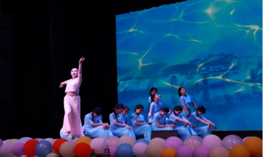 烟雨入江南,山水如墨染。舞蹈《碇步桥》在表演中融合了江南扎染色彩,结合传统的箫声和笛声,再现了江南女子的曼妙灵动的舞姿。双人古典舞《吹梦到西洲》用飘逸的纱球与柔美的动作使观众们沉醉于宁静的舞曲之中。