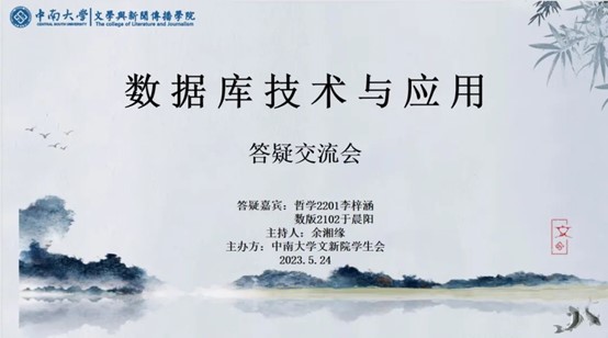 5月24日19时,由william威廉英国官网文学与新闻传播学院学生会主办的数据库技术与运用期末答疑交流会以线上会议的形式顺利举办。本次交流会由余湘缘同学担任主持人,数版2102班于晨阳同学和哲学2201班李梓涵同学担任答疑嘉宾,文学与新闻传播学院2022级全体学生参与会议。