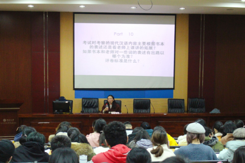 李星辉教授首先介绍现代汉语的学习理念。她认为,学习现代汉语的目的不仅仅在于分数,而更应传承母语,应用母语来解决生活中的问题。语言学虽然属于人文社科,但也是充满理性思维与严谨分析的学科。同时,她也为同学们指出了复习现代汉语中的主要问题,强调在复习背诵、书写难度较大的国际音标时,应注意理解性记忆,而避免死记硬背,主要记忆其规律与类别。