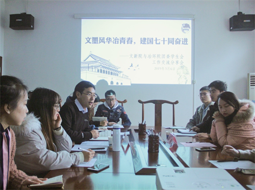 3月6日,文学与新闻传播学院和冶金与环境学院“文墨风华冶青春,建国七十共奋进”团学干部工作交流会在文法楼227会议室顺利召开。