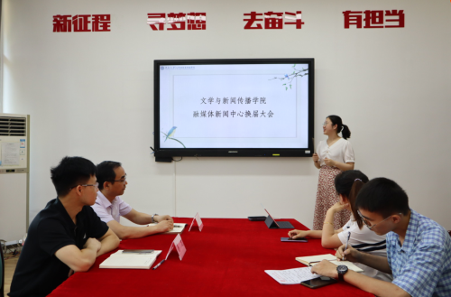 6月8日中午12时30分,文学与新闻传播学院融媒体新闻中心换届大会于文法楼234会议室顺利举行。院党委委员、融媒体新闻中心执行主任刘新少副院长,院党委委员、融媒体新闻中心顾问易龙老师及融媒体新闻中心各部门负责人出席会议。
