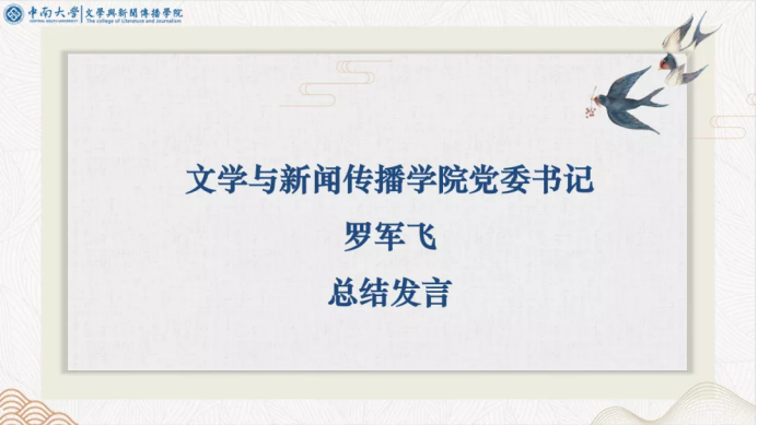 最后由罗军飞书记总结致辞。罗书记对优秀毕业生的经验分享表示感谢,同时希望同学们能向优秀校友学习,潜心钻研,珍惜大学时光,在新时代接续奋斗,不负韶华。