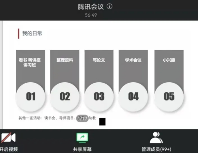 2012级毕业生马赜博儿、2013级毕业生温晓萌进行了科研方面的经验分享。马赜博儿2019年硕士毕业于山东大学文学院文艺学专业,现为南京大学艺术学院艺术文化学专业博士生。温晓萌2020年硕士毕业于四川大学汉语言文字学专业,现为四川大学汉语言文字学博士生。马赜博儿认为,若志在科研,就要抱着开放的心态广泛学习,勇于尝试,探索自己的兴趣,并适当提高目标,坚定信心。温晓萌则简单分享了自己的日常,介绍了自己的一些课程,并对读研、读博提出了建议。