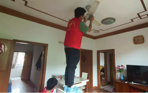 (志愿者帮助居民擦拭电风扇)