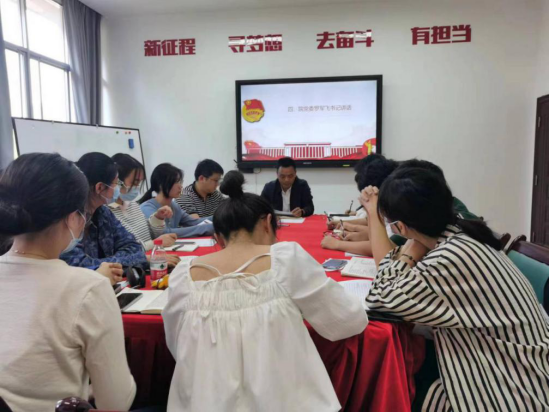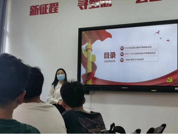 在会上,杨紫金老师为同学们带来“习近平总书记五四讲话对教育工作的启发”专题学习。她逐一梳理了从2013年至2022年习近平总书记“五四”讲话中关于教育的重要论述,号召同学们珍惜学习机会,争做时代新人。最后,以一名教育工作者的身份发表了其对教育工作的感悟:遵循青年成长规律,保持仁爱之心,为实现立德树人的根本任务而努力奋斗。