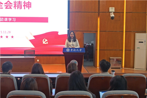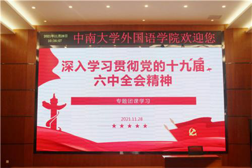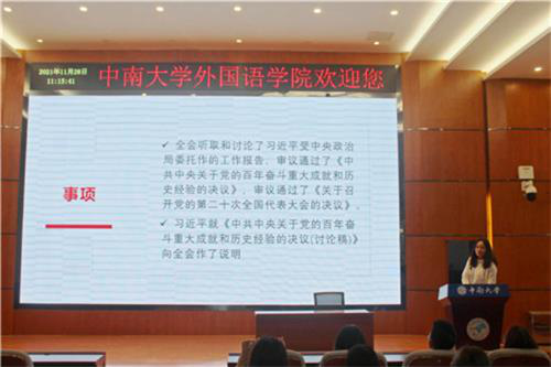 2021年11月28日上午10:30,外国语学院团委学生会“深入学习贯彻党的十九届六中全会精神”专题团课在新校区外语楼国际报告厅顺利举行。此次会议由外国语学院团委书记李雅丽主持,外语院团委、学生会全体学生骨干参加本次会议。