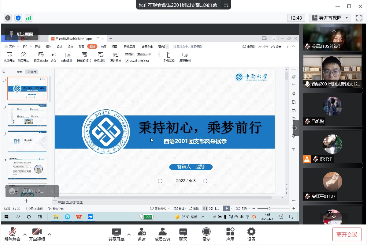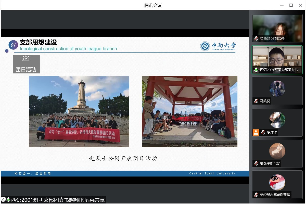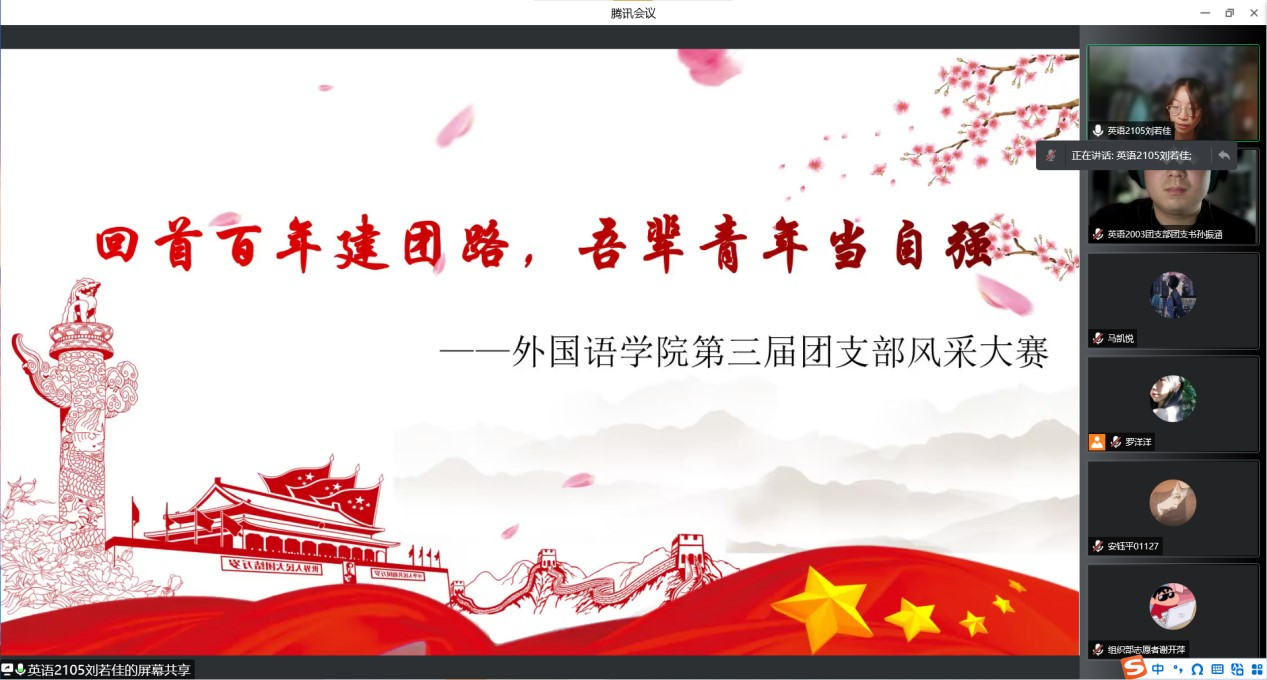 为进一步加强我院基层团组织建设,增进各团支部的之间的联系,展示我院青年团员团结创新、锐意进取、蓬勃向上的良好精神风貌,营造积极向上的校园文化氛围,并积极响应校团委的号召,外国语学院团委于4月3日14点在腾讯会议成功举办了“回首百年建团路,吾辈青年当自强”第三届团支部风采大赛。