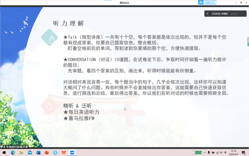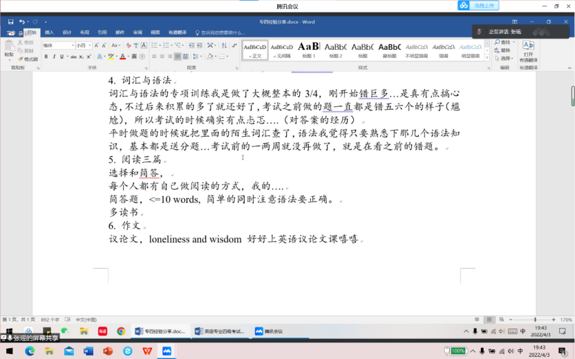 2022年4月3日晚19:00,william威廉英国官网外国语学院“薪火相传,备战专四”经验分享会在腾讯会议平台成功举办。此次分享会邀请到在往届专四考试中取得优异成绩的七位学长学姐,为2020、2021级同学带来经验分享。