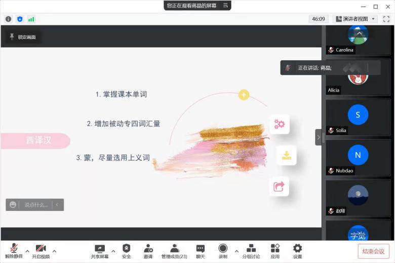 西语1901班蒋晶首先向大家分享了三条西译汉的方法,即掌握课本单词、增加被动专四词汇量和尽量选用上义词。之后她又详细地介绍了一些失分高频错误点,并指出在动词变位、完形填空方面应注意的问题。