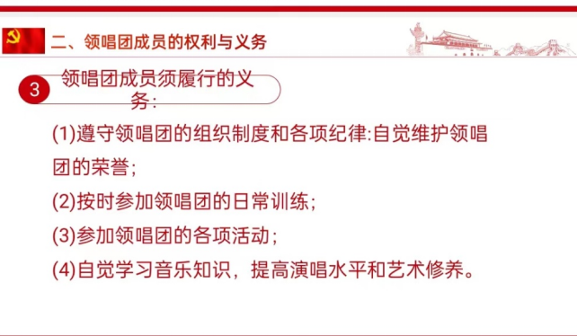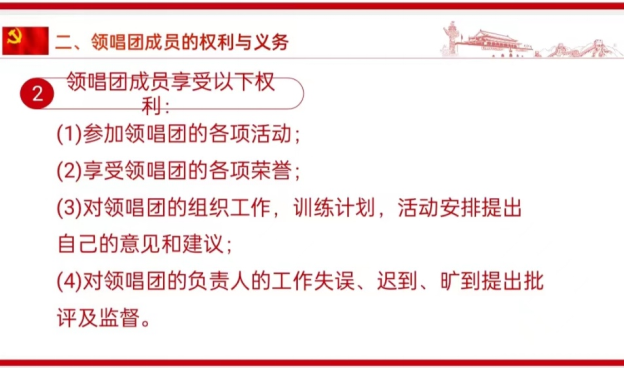 作为领唱团成员,享有相应的权利,如参加领唱团的各项活动,享受领唱团的各项荣誉,对领唱团的工作安排提出建议,对负责人的工作进行监督等。与此同时,领唱团成员也须履行相应的义务,如按时参加领唱团的各项活动等。同时,她还强调了领唱团的考核标准,要求团员严格遵守团内管理制度。