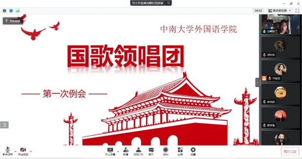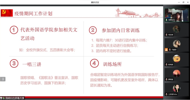 为响应“高唱国歌,共讲党史”的号召,我院在校团委、院党委的指导下成立了国歌领唱团。4月7日晚19点,我院国歌领唱团第一次例会于腾讯会议成功召开,国歌领唱团团长周嵘铃担任会议主持人,领唱团全体成员参会。
