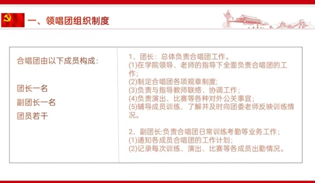 周嵘铃首先介绍了国歌领唱团的规章制度,以提高我院学生思想政治素养,激发学生爱党爱国热情,增强理想信念。规章制度包括三方面:领唱团组织制度、领唱团成员的权利与义务及领唱团管理制度。
